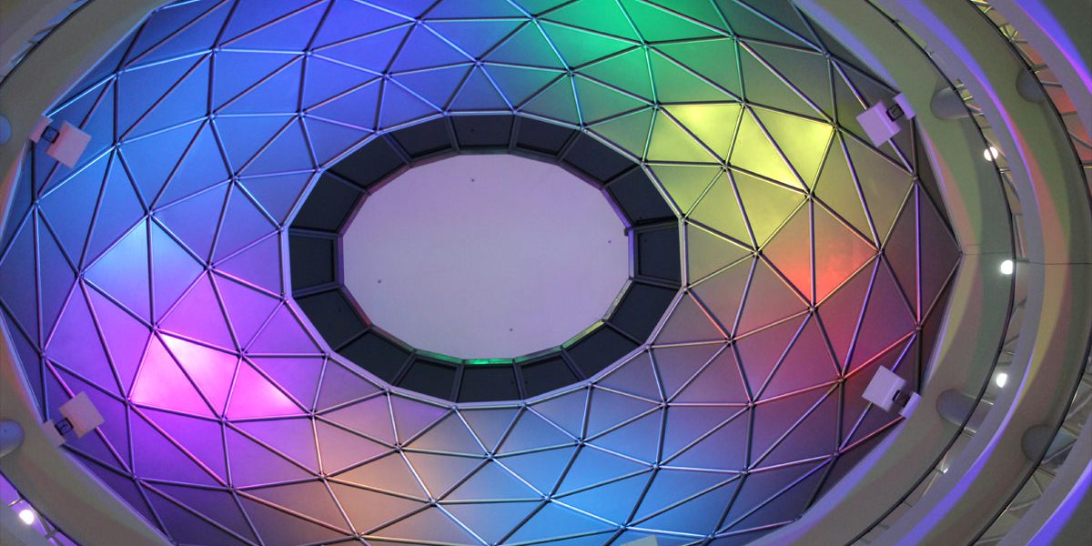 The eight Studio Due ArchiBars are located around the base of the atrium from where they can shoot coloured light up the walls leading up to the dome.