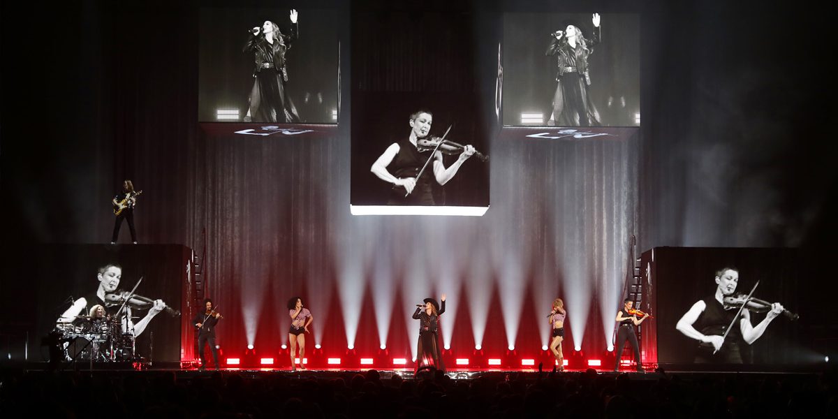 The production features 48 Claypaky Mythos2 and 80 Scenius Unico fixtures. “The Unicos are the main workhorse of the lighting rig: They provide key light, back light and floor lighting,” explains Creative Director and Production Designer Rob Sinclair. “The Mythos2 are hung on upstage torms and side ‘cakes’ to provide fill and big-picture looks during the show.”