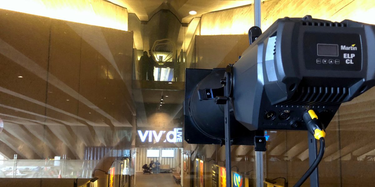 As part of Vivid Live Festival at the Sydney Opera House, in conjunction with Vivid Festival, the public areas of the Opera House are spruced up with light, colour and gobos, all in aid of a more contemporary feel, to go hand in hand with the music festival. However the Western Foyer entrance is a challenging area as there is nowhere to rig lights with only the lip of an awning outside of the glass from which to project.